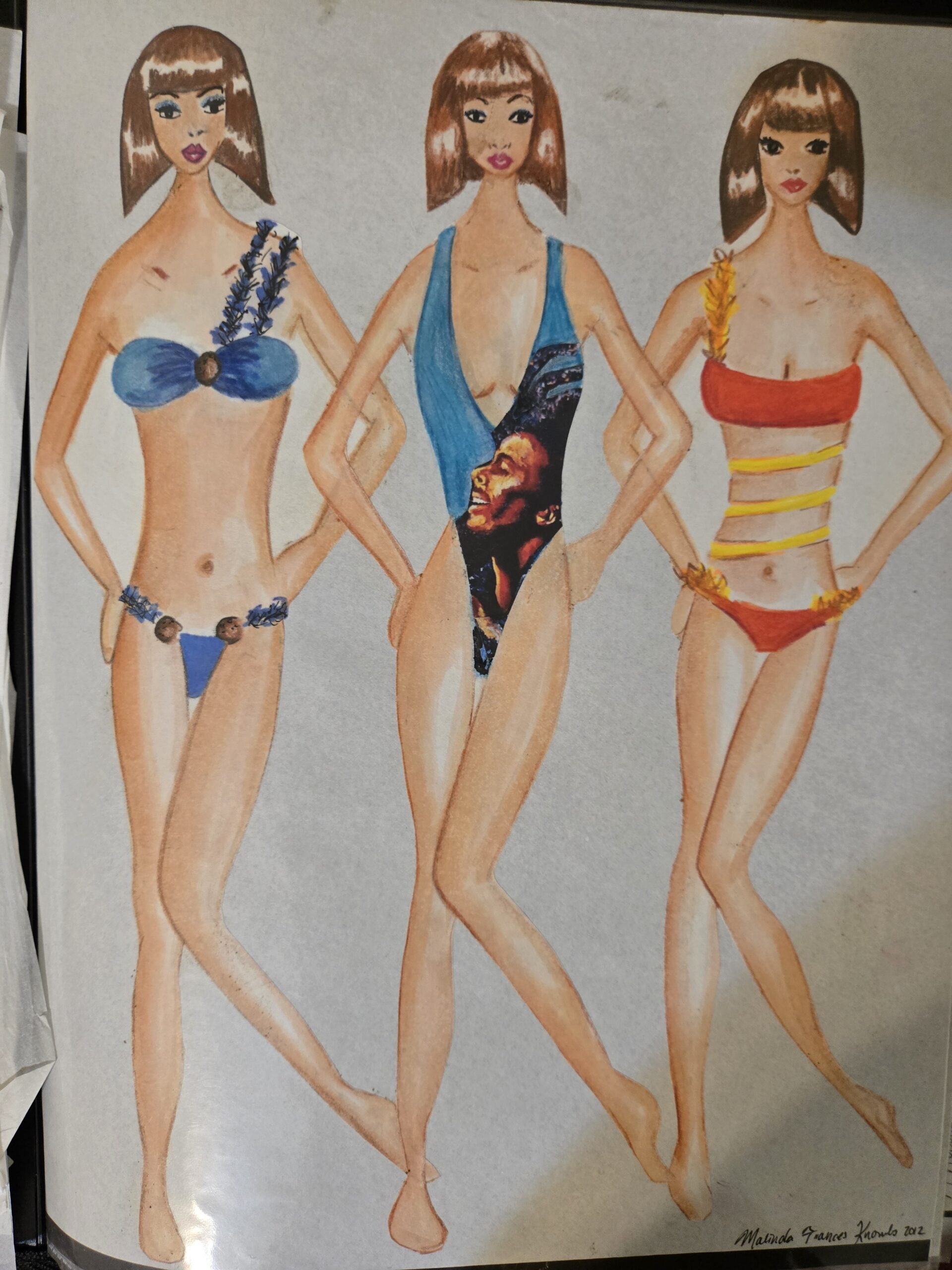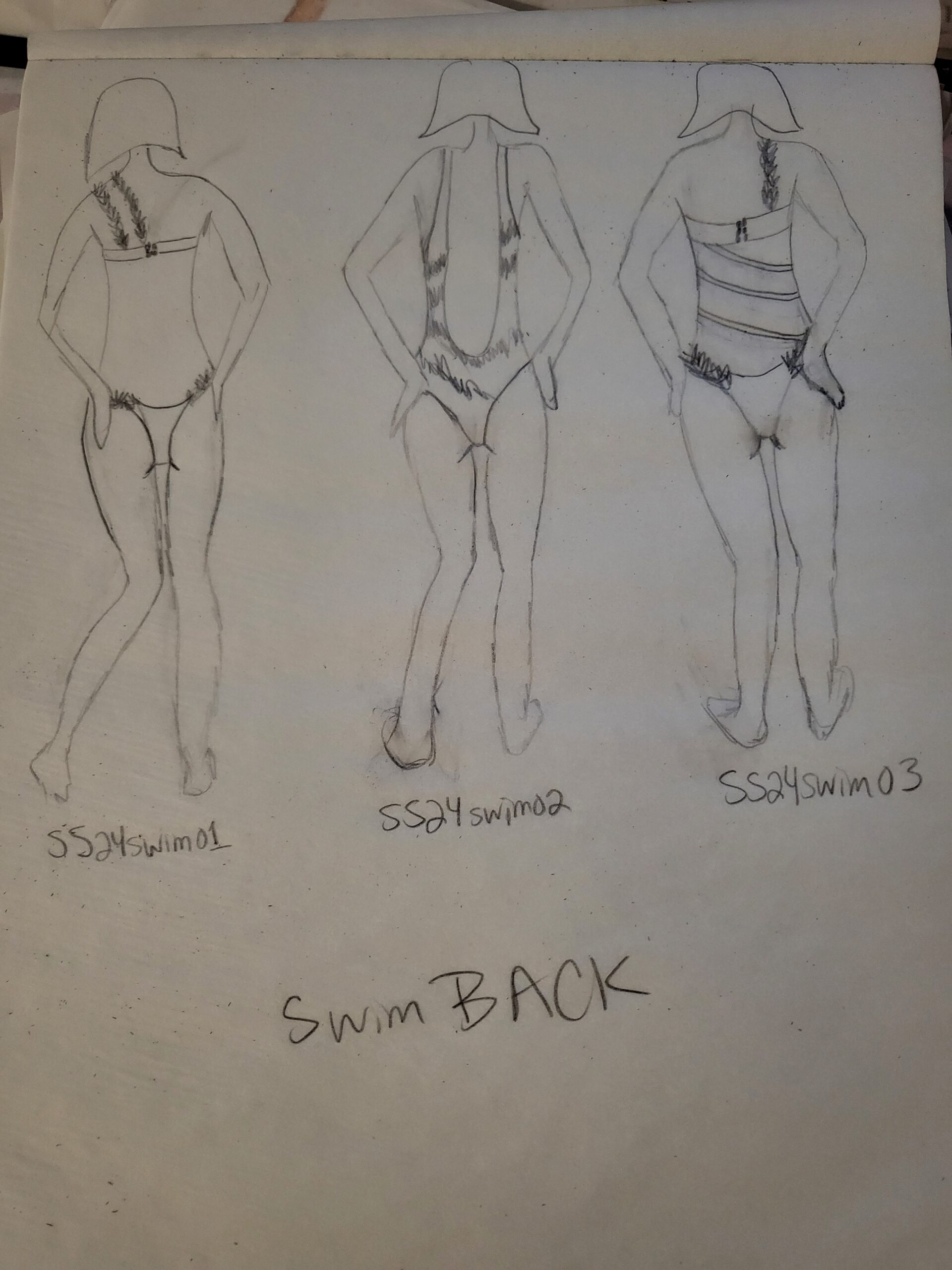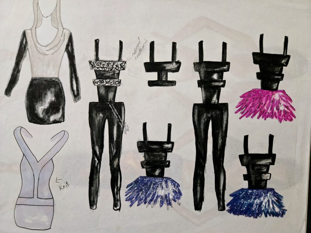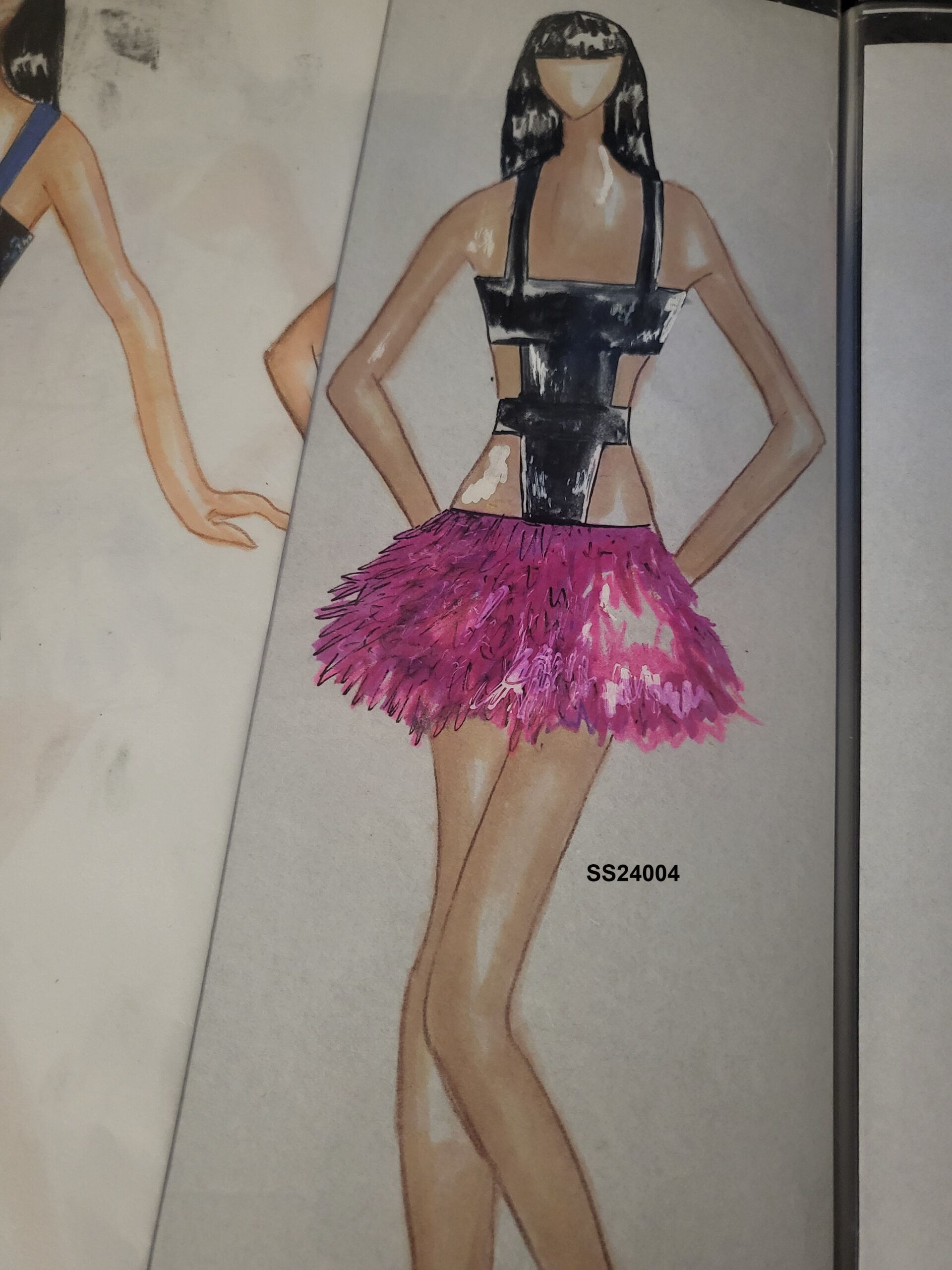 What do you think of these sketches? If you like one, please use the contact form and let me know. It was recently Miami Swim Week and it’s been really hot in Florida. I sketched some swimsuits (above) and included the view from the back (below). It’s the summer and no matter what bikini body you have, one of these would probably look great on you. I also had sketched some Spring leather pieces with pink and blue feathers as it still is a little chilly in the Spring/Summer in some spots. What’s your favorite? Tell me in the comments below.